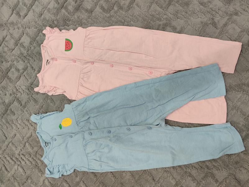 Розовый ромпер (песочник): Он имеет короткие рукава с оборками. Спереди расположены пуговицы по всей длине для легкого одевания. На груди вышитая нашивка в виде ломтики арбуза. Голубой ромпер (песочник): Он также имеет короткие рукава с оборками. Спереди также есть пуговицы по всей длине. На груди вышитая нашивка в виде лимона. Оба комбинезона выполнены из хлопковой ткани и выглядят как летняя или домашняя одежда для младенцев. Размер 80. Без повреждений.