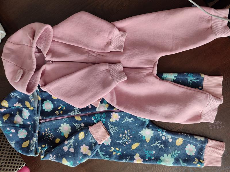 Два детских комбинезона или ромпера, аккуратно сложенные на темной деревянной поверхности. Розовый комбинезон: Размер: 92 Однотонный, светло-розового цвета. Имеет капюшон с небольшими декоративными ушками. Застегивается на молнию спереди. Рукава и штанины заканчиваются эластичными манжетами в тон. Материал: трикотаж утепленный начесом. Темно-синий комбинезон: Темно-синего цвета с ярким цветочным и растительным принтом (голубые, желтые и белые элементы). Также имеет капюшон и застежку-молнию спереди. Манжеты на рукавах и штанинах выполнены в светло-розовом цвете, который подходит к другому комбинезоне. Материал: трикотаж утепленный. Размер: 86-92