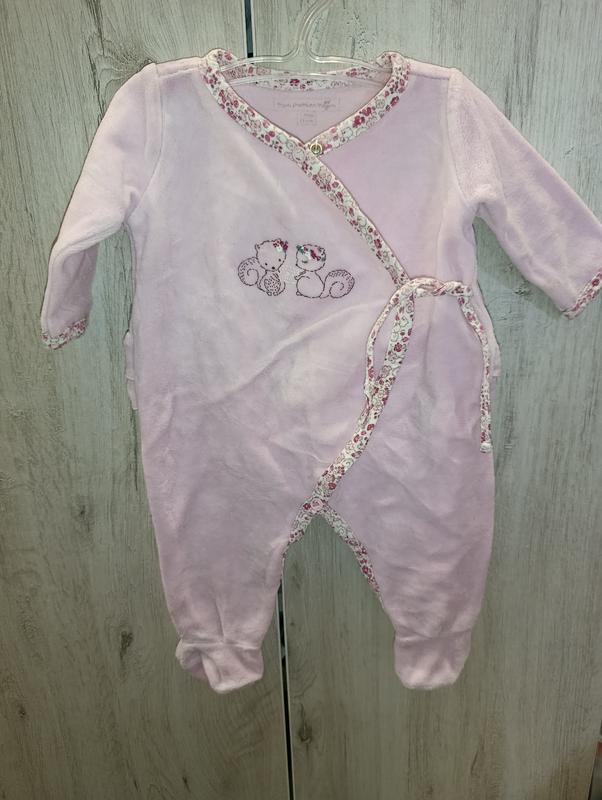 Теплый плюшевый розовый человечек на завязках и кнопках, с цветным кантом, на спинке рюши, ножки закрытые, рукава открыты.