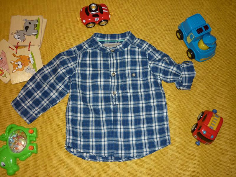Стильная рубашка NEXT оригинального покроя: ворот стоечка, сверху плоночка с пуговицами, внизу потайная застежка, рукава можно подвернуть. Размер указан 74, но будет дольше. Замеры: ПОГ 31см, длина рукава 25,5см, длина по спинке 36,5см. Состояние отличное.