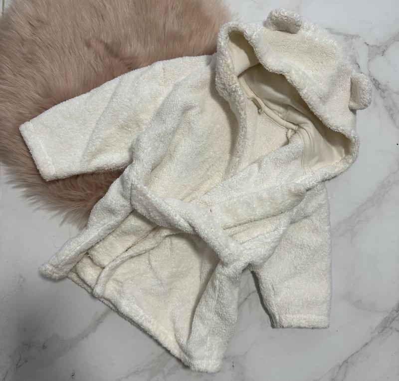Классный махровый халатик с ушками молочного цвета, на 6-9 мес, в целом состояние отличное, но есть пятнышко(видно на последнем фото), думаю, что можно отстирать, за счет пятнышка и цена такая