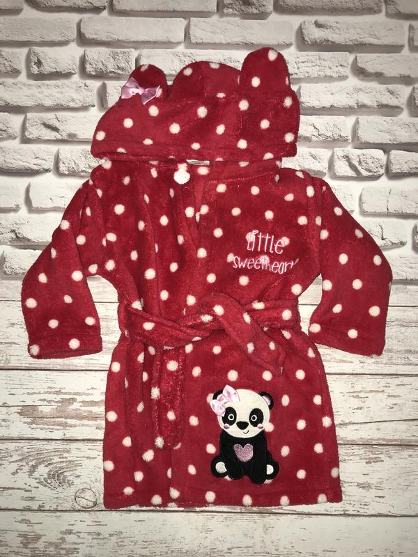 Детский красивый и яркий халатик, красный в белый горошек, с милой пандой. На возраст 9-12 месяцев. Но можно использовать до полтора года, примерно. Мягкий, приятный к телу. Завязывается ремешком на запах. Ещё есть кнопочка вверху.