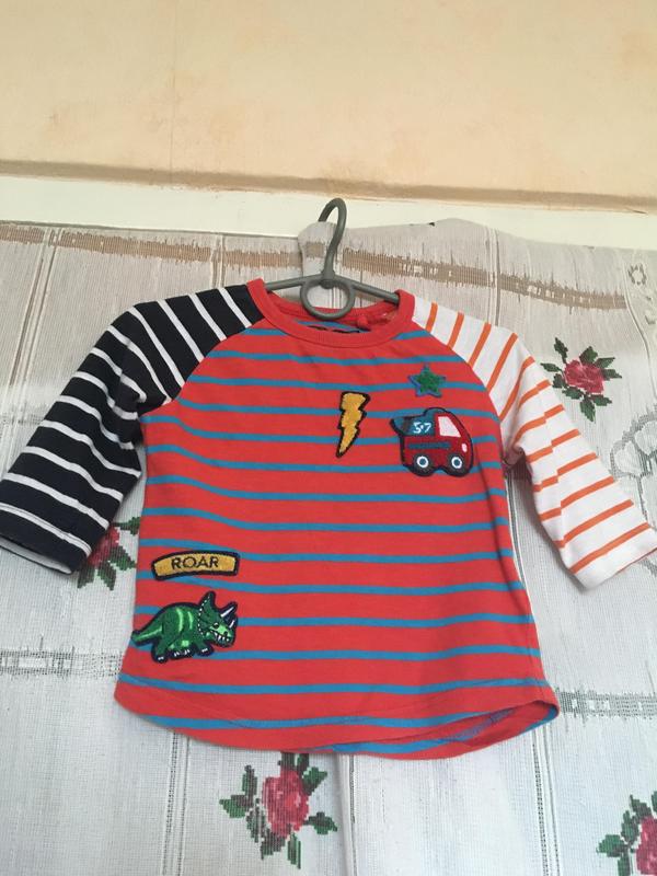 Чудова кофточка різнокольорова ,спереду дві аплікації,машинка і динозаврик,різнокольорові рукави,довжина рукава від шиї-28см.,довжина-32см.