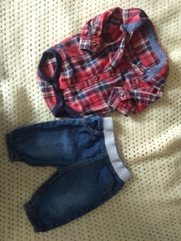 Костюм для мальчика 0-4 месяцев на рост 56-62 см. Длина бодика - 31 см. Ширина бодика - 24 см. Длина рукава - 19 см. Длина джинсов - 28 см. Ширина джинсов - 21 см