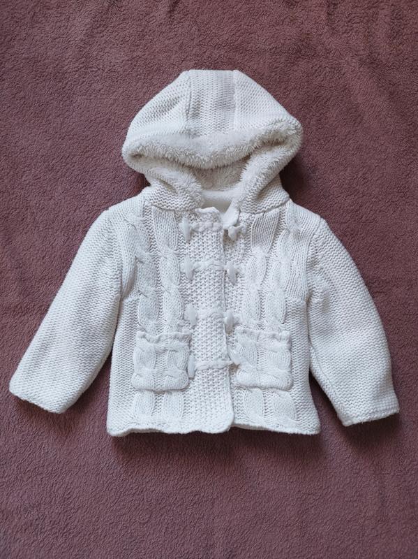 В’язана кофтинка на флісі Очень теплая Состояние очень красивое Размер 9-12 ориентируйтесь по замерам Длинна - 33, пог 29,рукав от горловины- 32,длина с капюшоном -50.