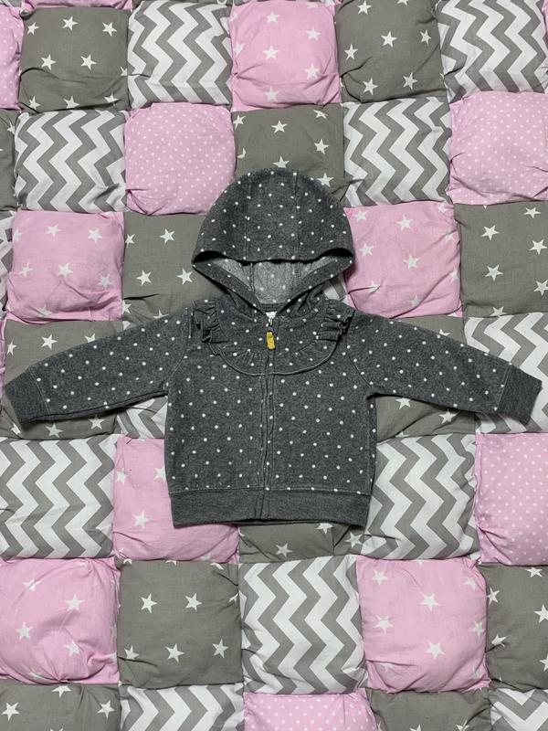 Кофта флисовая от фирмы Carter's, на молнии, в идеальном состоянии, очень удобная. Размер 6м. Нам подходило до 10 месяцев точно. Есть набор боди+ штанишки из набора уходили вместе с этой кофтой.