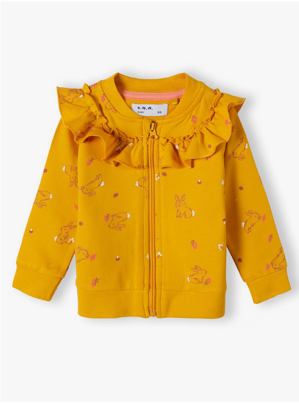 Хлопковая толстовка для девочки с декоративной оборкой - оранжевая. Размер: 80 Представляем хлопковую детскую кофточку для девочки с декоративной оборкой оранжевого цвета . Оборка на горловине и бретельках делает свитшот очень стильным и элегантным. К нему отлично подойдет хлопковое боди для ребенка оранжевого или розового цвета и леггинсы таких же цветов. Оригинальная выкройка хлопковой детской толстовки. Декоративная оборка не единственный очаровательный элемент толстовки, это еще и маленькие зайчики и розовые цветочки на ткани. Уверены, многим девушкам понравится. Комфорт превыше всего. Толстовка с длинными рукавами, она будет кстати круглый год, когда вам нужно позаботиться о тепле вашего ребенка. Преимуществом также является застежка-молния, благодаря которой можно легко, быстро и удобно снять одежду. Высококачественный хлопок в составе обеспечивает комфорт и удобство. Марка : 5.10.15. Цвет : оранжевый Коллекция : Осень/Зима Утепление : Да Состав : Основная ткань: 100% хлопок Манжеты: 95% хлопок, 5% эластан Количество элементов в наборе : 1 Пол : девочка Тип застежки : молния Тип материала : Трикотаж