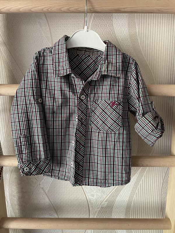 Рубашка размер 18-24 мес, 90. Состояние хорошее, есть маленькое пятно. Заходите на мой профиль, там еще много вещей для мальчика)
