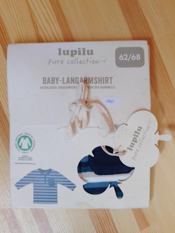 Упакована, отличный подарок. Чистый хлопок, на 3-6 месяца. Фирма Lupilu