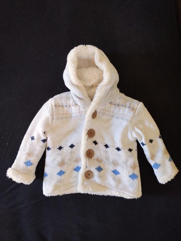 Кофта на пуговицах с капюшоном. на бирке указан возраст 9 месяцев, но актуально где-то на рост 68-74см, 6-9 месяцев. внешняя вязка, внутри махра. очень теплая. состояние 8 с 10.