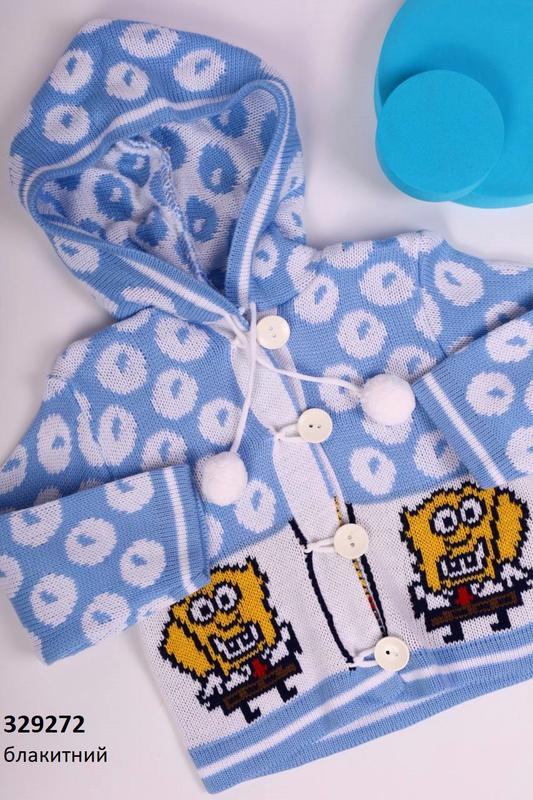 Кофта дитяча губка Боб.Матеріал в'язка,акріл 100% .Вироблено в Туреччині.Розмір 86.Заміри: плечі -28 см,рукав-25,5 см, довжина виробу -32 см.