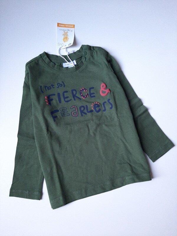 Лонгслив, реглан темно зеленого цвета с принтом спереди. Состав: 100 хлопок. Замеры: длина 35, плечах 22, рукав 30, в комоде 27 см Есть недостаток на остановке фото- как нить белая на ткани.