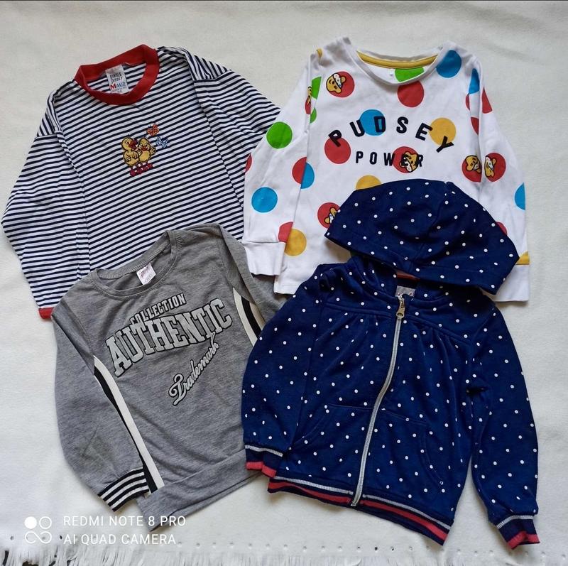 Набор на рост 86-98 см. но ориентируйтесь по замерам сверху полосатый длина 39, ширина 31,рукав 37,100%коттон в цветные шарики длина 33, ширина 27, рукав 38,97%коттон серая слева длина 34,ширина 29,рукав 37 кофта длина 33, ширина 30,рукав 38,50%коттон,50%полиэстер ціна за набір