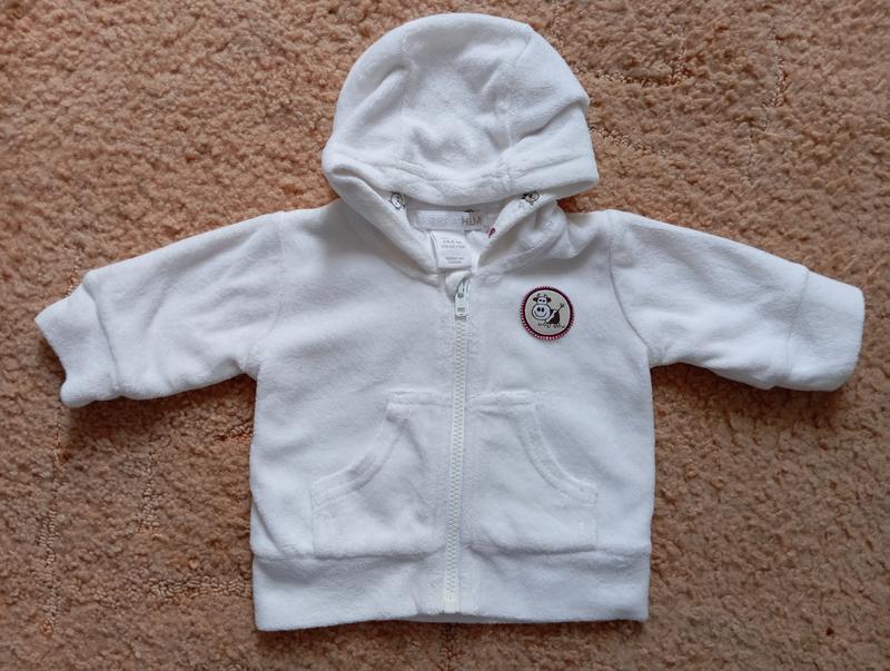 Дуже тепленька велюрова кофточка, зіп-худі. Велюр,утеплений бавовняною підкладкою.М'якенька і зручна, на вік 0-3 міс. Довжина 25 см, ширина 24 см, рукав 15,5 см Стан ідеальний. Підійде як хлопчику, так і дівчинці