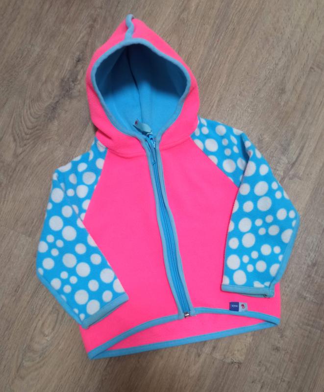 Яркая флисовая кофта в отличном состоянии на девочку.Размер 86 на 6-12 месяцев Длина спереди33см, сзади-36см. Длина рукава от горловины -36см.