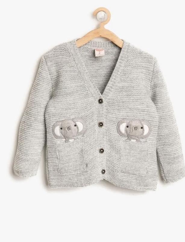 Кардиган сірого кольору . Довгий рукав , V- подібний виріз , аплікаціям вигляді слоника . Склад тканини 90%акрил , 10% поліпмід . На бірці опічатка з розміром , написано 18-24 по факту на 3-6 місяців .