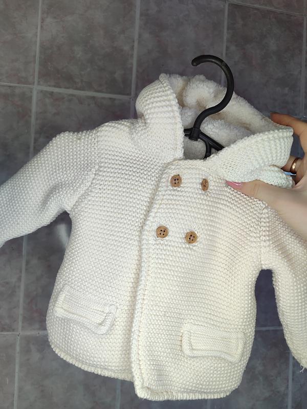 Дитяча кофточка, молочного кольору, в'язана з капюшоном, на меху, дуже тепленька, має плямку спереду, і ззаду на фото видно, розмір 3-6 місяців, якщо потрібні заміри запитуйте