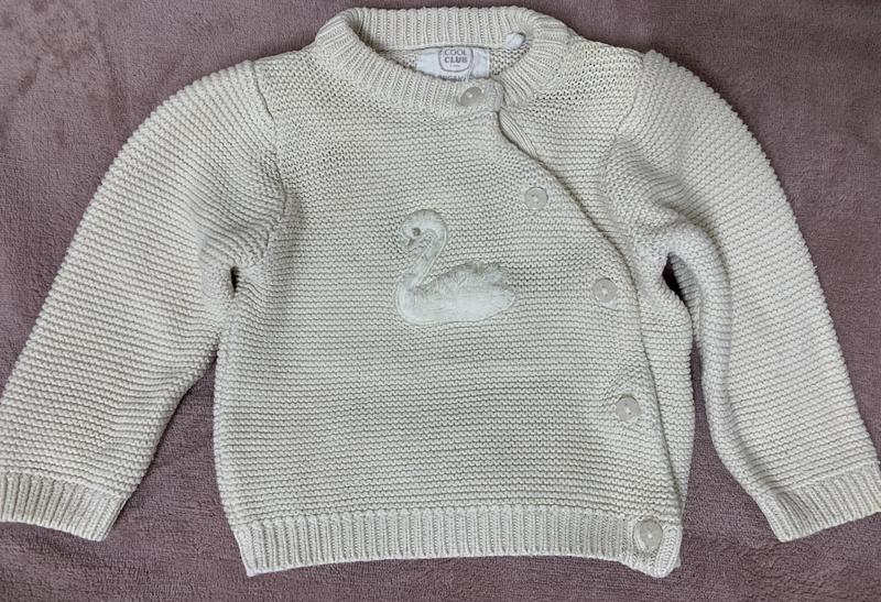 Красивый свитерик на девочку, очень приятный материал, молочного цвета. Размер 62, но маломерит немножко, лучше 56-62.