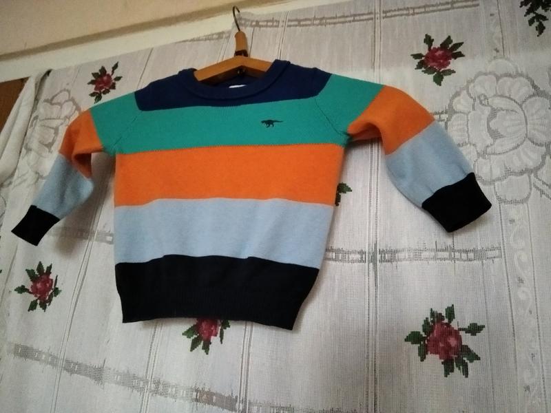 Пречувствительная кофта в сине-зелено-оранжевую полоска, на левой стороне груди-эмблема фирмы-резинка на круг шеи, низ рукавов и низ кофты-широка манжет-резинка, длина рукавов-28см.,длина кофты-34см.