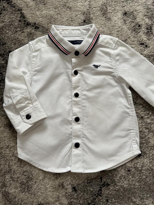 Рубашка бу один раз, в новом состоянии. По бирке 3-6 мес, но большемерит. Длина 31, ширина подмышками 25, ширина в плечах 21, рукав 22 + плечо 6. Классный плотный котон.