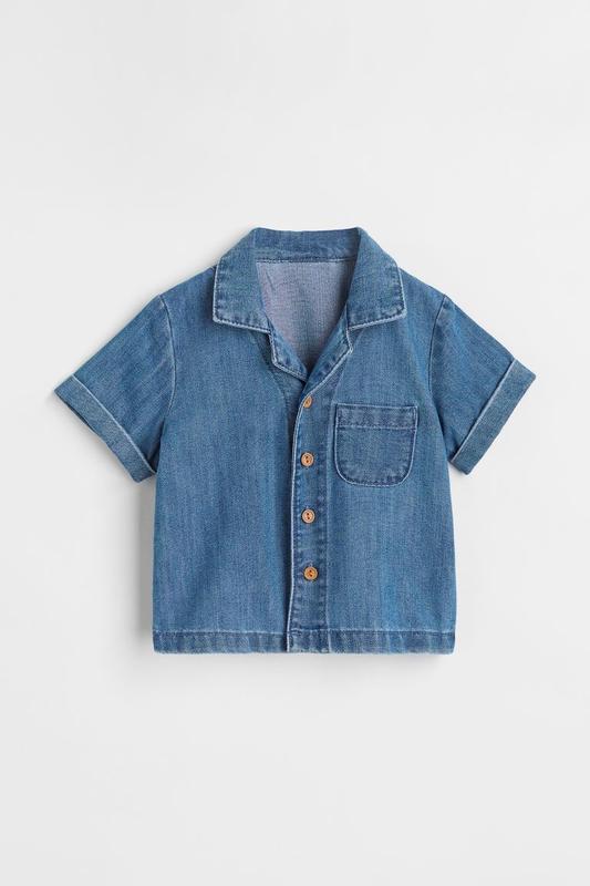 Рубашка с короткими рукавами из прочного денима с воротником, пуговицами спереди и открытым нагрудным карманом.