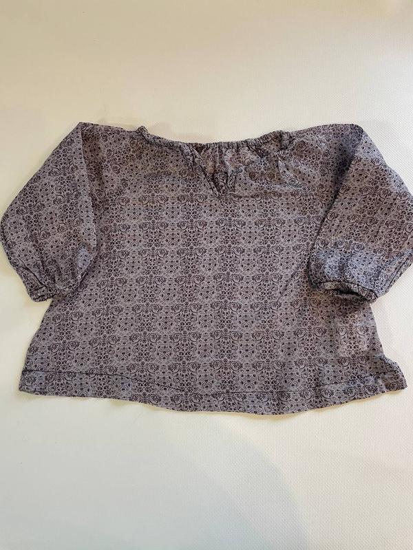 Очень лёгкая блузка в идеальном состоянии на ребенка 3-6 месяцев. Длина изделия по спинке от плеча 30 см, ПОГ 28 см, рукав реглан, длина рукава от подмышки 18 см. Ткань немного тянется. Модель 4045