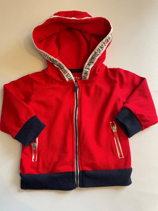 Минимальный заказ у продавца на 100 грн. Хорошенькая красная кофта с капюшоном на молнии Primark в отличном состоянии на ребенка 6-9 месяцев. Длина изделия по спинке 28 см, ПОГ 27 см, длина рукава 23 см. На рукавах и понизу резинка. Ткань тянется. Дешевле и больше товара на kupi-slona*pp*ua Модель 4084