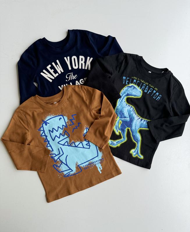 Тонкие регланы от Н&М Размеры 🌾1,5-2 есть все 🌾2-4 является темный с динозавром 🌾4-6 есть все 🌾6-8 представляет собой надпись и коричневый 🏷️240 грн/1 Замеры 📏1,5-2: рукав 31, длина 39 📏2-4: рукав 34, длина 42 📏4-6: рукав 40, длина 46 📏6-8: рукав 45, длина 49