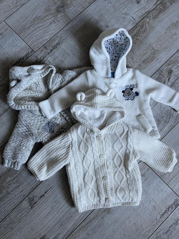 Продам комплектом теплі кофтинки на дівчинку,в ідеальному стані.Розмір від 56 до 62 см,вдягали і в 4 місяці.Розмір від 0 до 3 місяців.Всі теплі,додаткові заміри скину.