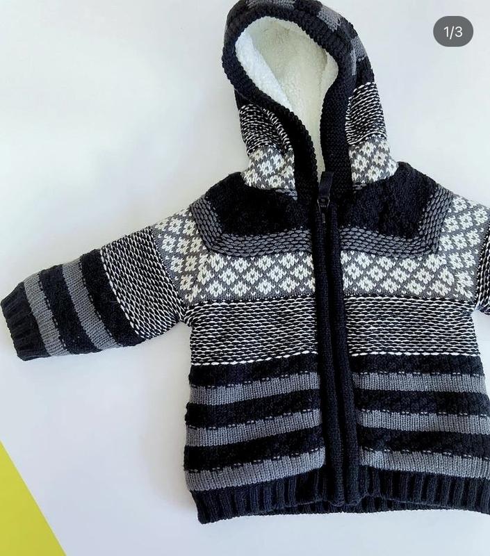 Кофта дуже тепла на густому флісі, з капюшоном, можна одягати замість куртки Фірма Nutmeg Розмір 3-6 міс (68 см), довжина кофти 33 см Кофта нова! Склад: 100% поліестер (внутрішняя), 100% акрил (зовн). Із зовн сторони вона вʼязана.
