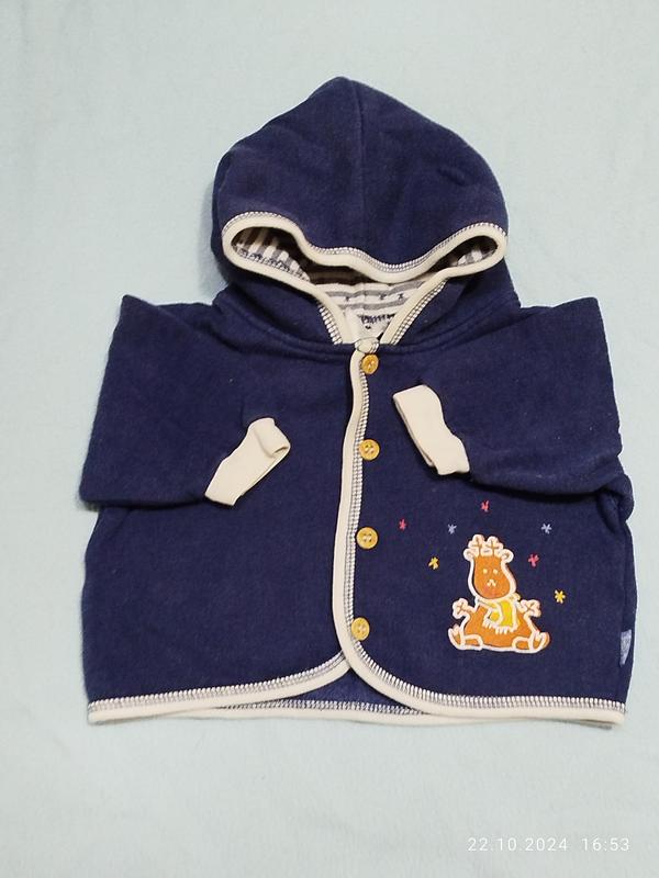 Минимальный заказ у продавца на 100 грн. Кофточка тёмно-синего цвета с капюшоном на тонком флисе на новорожденного малыша в отличном состоянии. Длина изделия по спинке от плеча 23 см, полуобхват груди 28 см, длина рукава 14 см. Ткань немного тянется. Модель 5323Д