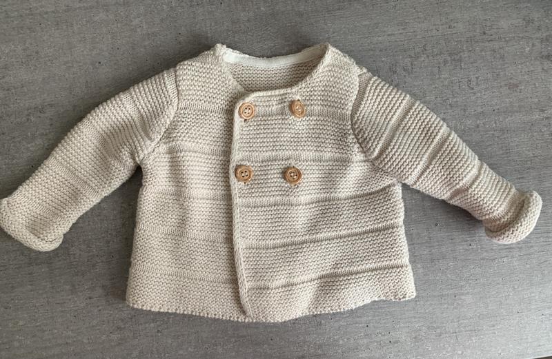 Тепленькая вязаная кофта с капюшоном на пуговицах. 100% хлопок. На возраст 0-3 месяца. Стан - идеальный