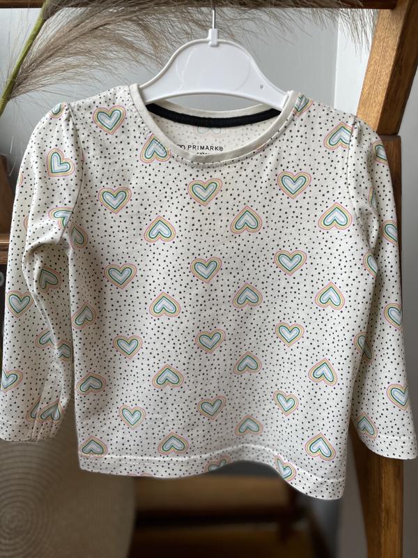 Лонгслив цвета крем сердечки. Фирмы Primark по сборке 18-24 месяцев (92 см). Замеры: длина изделия 34 см, длина рукава 29 см. Состояние нового, без бумажной бирки.