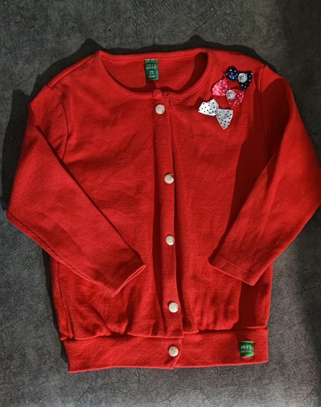 Дитяча кофтинка для дівчинки: Яскраво-червона, трикотажна кофтинка для маленької модниц! Бантики на грудях додають образу ніжності — саме те, що потрібно для маленької принцеси! Бренд HEES відомий якістю своїх дитячих речей, тому ви можете бути впевнені, що кофтинка довго радуватиме вас і вашу дитину. На етикетці написано на 8-9 років, але насправді підійде для дівчинки віком 5-6 років (115 см). Чудовий вибір як для щоденних прогулянок, так і для святкових подій! Не проґавте шанс подарувати своїй донечці стиль і затишок!