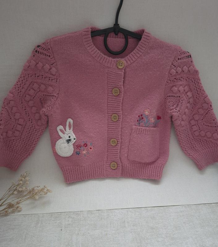 Вязаная розовая кофточка на пуговицах с вышивками и аппликацией Замеры: плечи 22 см ПОГ 29 см длина 29 см рукав 25 см