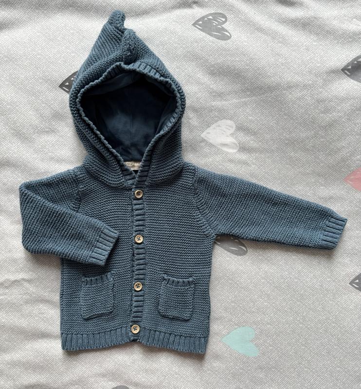 Кофтинка на хлопчика з капюшоном дракончика. В капюшоні внутрі бавовняна підкладка. Розмір 2-6 місяців. Матеріал органічний котон.