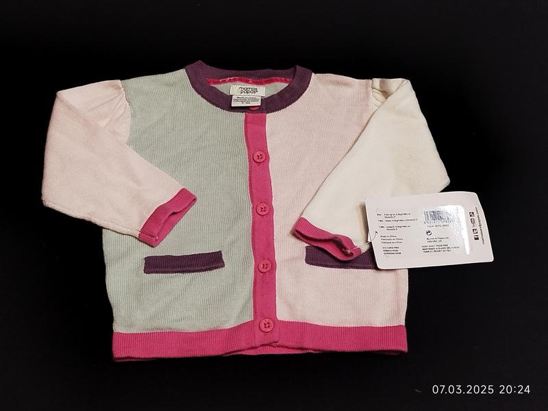 Очень классная фирменная кофточка на новорожденного малыша до трёх месяцев. Длина изделия по спинке от плеча 25 см, полуобхват груди 24 см, длина рукава 19 см. Ткань хлопок, тянется. Модель 6042