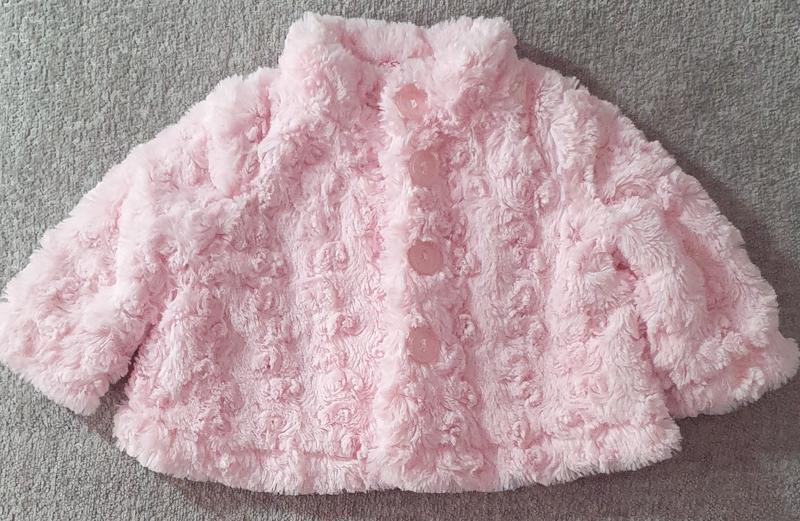 Накидка подойдет на летнюю прохладную погоду, розовая плюшевая шубка -болеро для новорожденной девочки, на бирке указана на 0-3 месяца.Можна быстро одеть в прохладную погоду Длина 24 см.ширина под руками 24 см.длина рукавчика от горловины 25см.