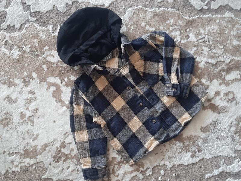 Рубашка байковая на мальчика. Стильная, возможная на футболку вместо ветровки.Имеет трикотажный капюшон (не съемный). Длина 33 Ширина под подмышками 30 Плечи 26 Длина рукава 26 Размер 92 см.(1,5-2роки)