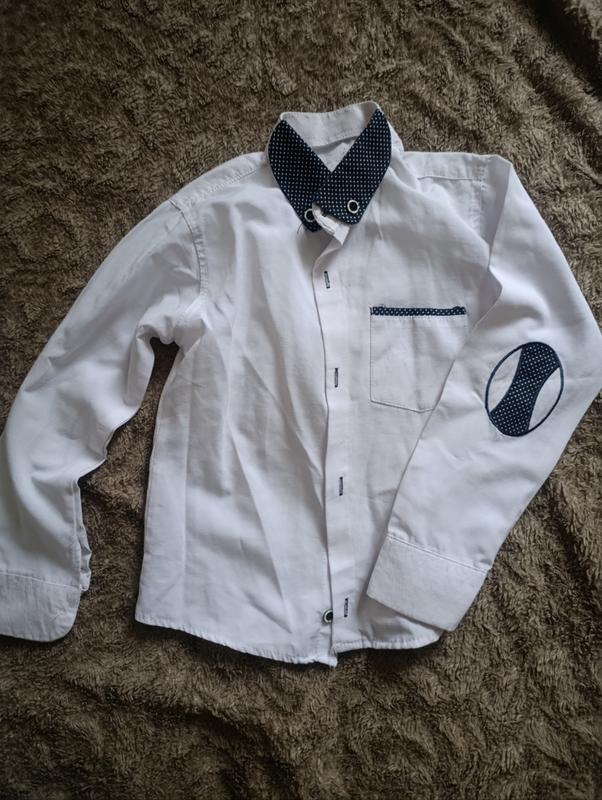 Сорочка біла з синіми латками на рукавах. Підійде на вік 7-8 років. Усі заміри зроблю, запитуйте.