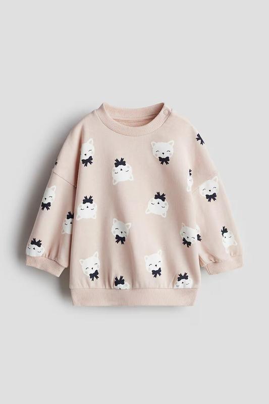 Свитшот розового цвета с принтом котиков для девочки. Круглая горловина резиночкой, которая застегивается на кнопку с одной стороны. Состав: 100% хлопок, футер.
