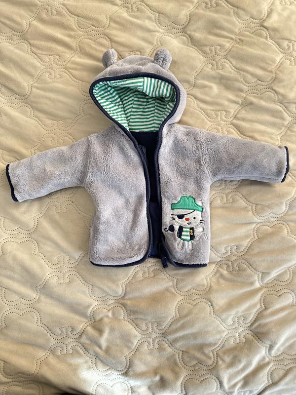 • Матеріал: м’який плюшевий велюр • Колір: сірий із вишивкою котика (зовні) / зелені смужки (всередині) • Можна носити з обох боків — двостороння • Капюшон з вушками 🐻 • Застібка-блискавка 📏 Розмір: • Довжина: 29 см • Рукав: 18 см 👶 Підійде для малюка ~0–6 міс. Стан: відмінний, без плям і дефектів.