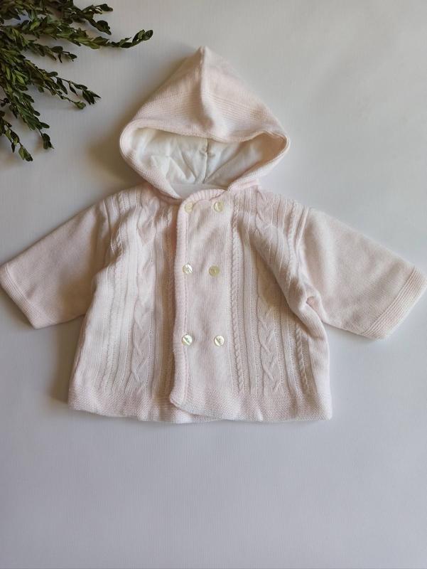 теплая кофта для новорожденного на 0-6 мес. с синтепоновой прослойкой. Подкладка 100% хлопок и верх бирцы 50% шерсть и 50% акрил. Кофта широкая можно одевать на любую одежду ребенку будет не тесно в ней, фирма NEXT. Цвет нежно - розовый. Стан очень хороший, идеальный, верх без катушек на фото показала.. Замеры: длина по спинке от капюшона 33-34 см, по плечам от проймы до проймы 31 см, сама пройма 15 см, ширина в груди: 36 см длина рукава от плечевого шва 19 см. ПО низу 36 см. высота капюшона 25 см Не секенд. Смотрите другие Мои объемы, экономите на доставке