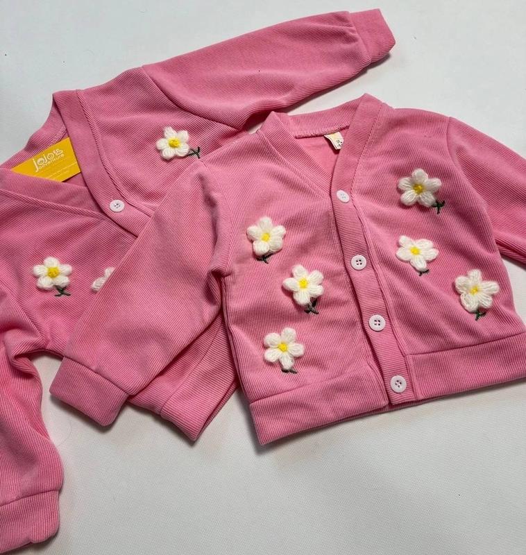 Гарненька кофтинка Тканина - машинна в'язка, приємна до тіла Дуже ніжний рожевий колір На рукавах та знизу кофти манжети Застібається на ґудзики Прикрашена об'ємними квіточками з шерстяних ниток Розмір 80, 90, 110