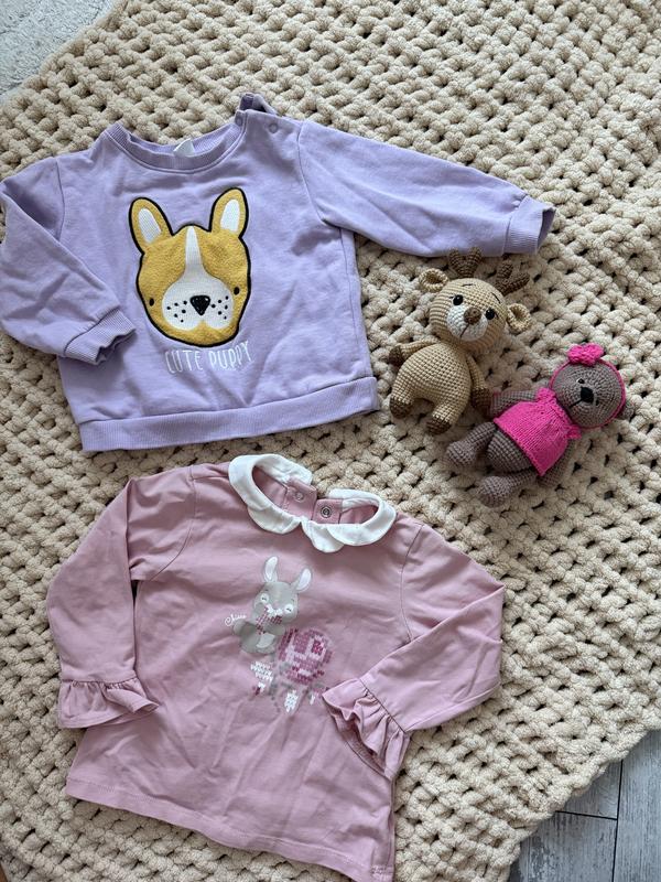 Кофточки на дівчинку Рожева блузка Chicco з зайчиком, тоненька, дуже приємна якість, позаду на кнопочках. Розмір 80, на 15 міс. (Від 9 міс до 1,5 року). Лілова (фіолетова) кофточка - світшот з песиком Cool Club на флісі, тепла. Розмір 80. Ціна вказана за 1 кофту. Обидві віддам за 400 грн.