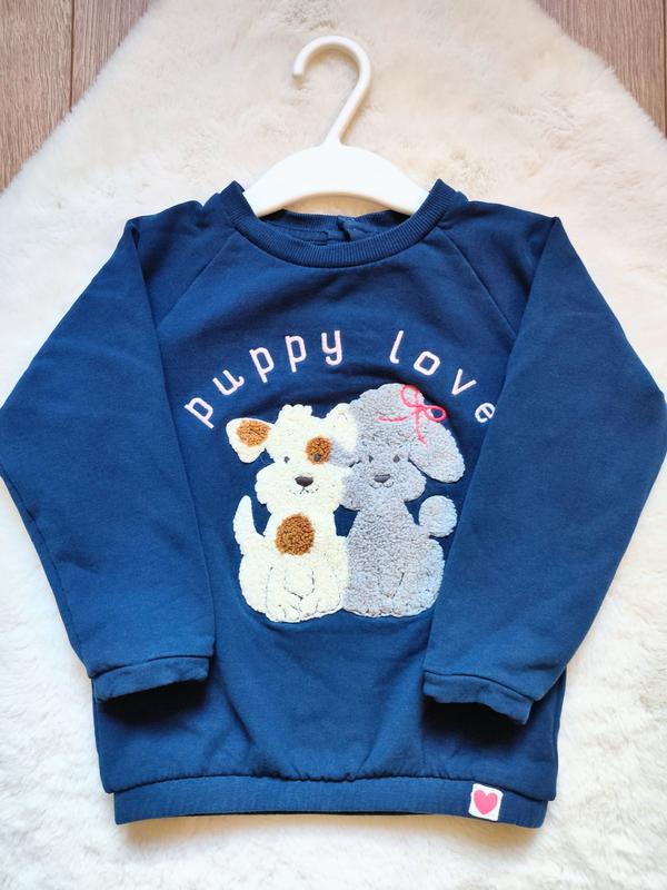 Свитшот с аппликацией щенков от бренда M&S для девочки в возрасте 18-24 месяцев, на рост 90 см 🐶💙🎀 Отличный состав: 96% хлопок, 4% эластан Внутри флисовое утепление 🐰 Замеры: Длина 36 см Рукав от горловины 36 см Ширина под рукавами 32 см