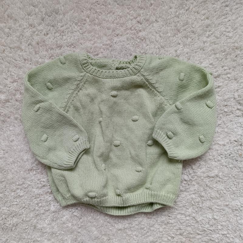 Светрик салатового кольору на 12 месяцев, но будет даже дольше есть незначительное пятно (последнее фото)