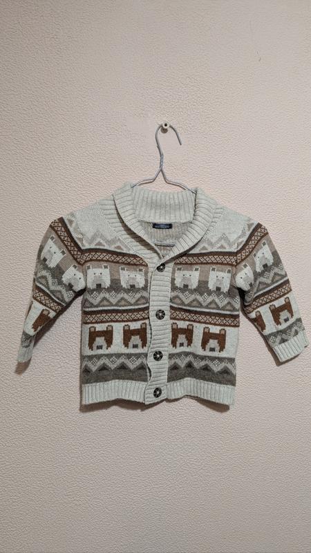детский кардиган имеет характерный узор с изображением медведей и узором "fair isle" (или норвежским узором).