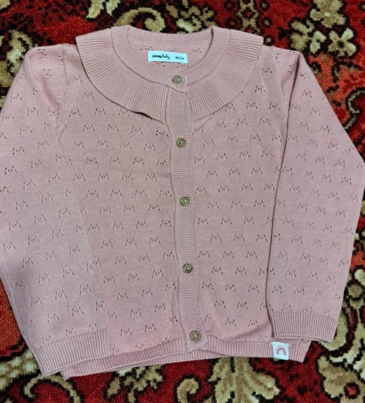 Кофтинка для дівчинки, в'язана, на гудзиках, з комірцем. Розмір 98. Довжина по спинці 35 см, довжина рукава 36, 5 см, напівобхват 32 см.