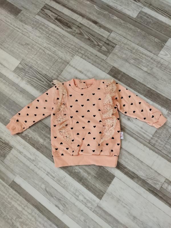 Кофта на девочку, персикового цвета в сердечко. Заміри надам при потребі ☑️ Есть недостаток, пятнышки и застегивающийся рукав, последнее фото.